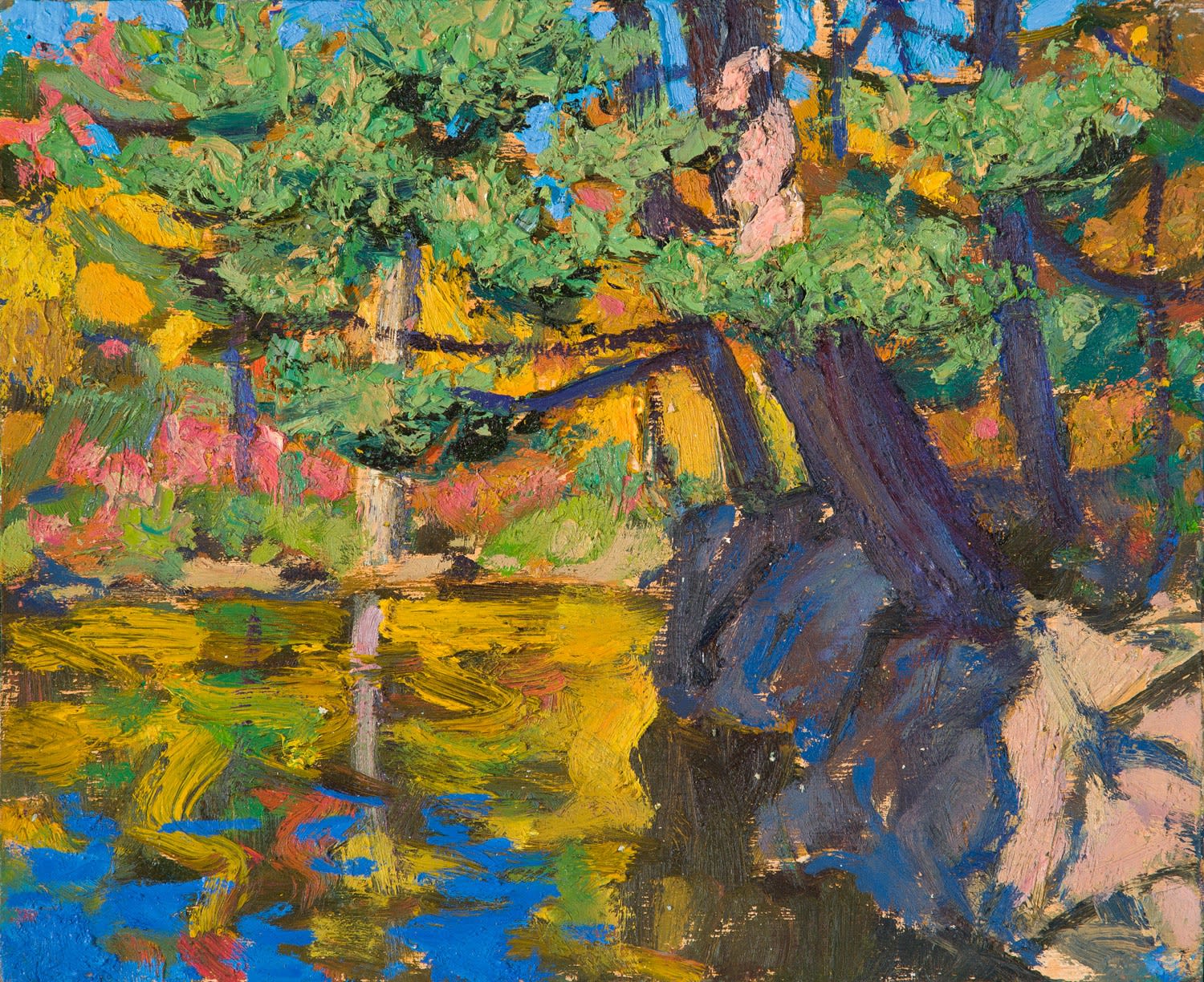 Thomson didn’t do anything startling, especially in light of his contemporaries in Europe. No new language, like Cubism, no Fauvist insight, no questioning of reality. Against such seismic tremors, the work of Tom Thomson would barely register. What set him apart was his trajectory. David Silcox says: ‘Had he not in his last five years created these panels of magic, his life and death would have passed unnoticed’. Harold Town writes ‘Theirs (Thomson and the Group of seven) was an involution of pivotal national significance precisely because it did not mirror, substantiate, imitate or pay the slightest heed to world art’.